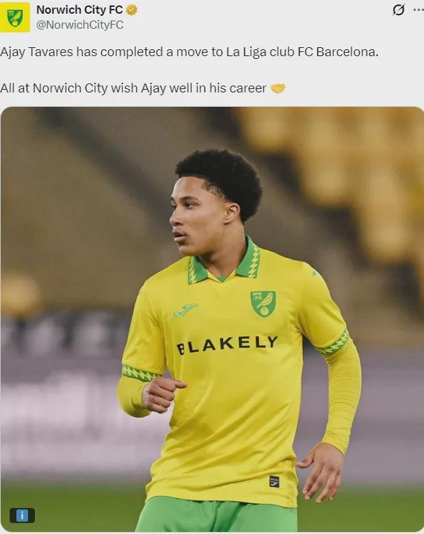 官方:諾維奇宣布年輕的邊鋒阿賈伊-塔瓦雷斯轉(zhuǎn)會(huì)加盟了巴薩。