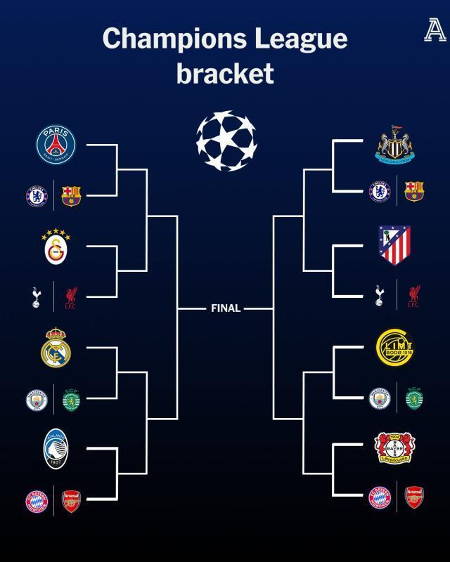 亞特蘭大、勒沃庫(kù)森、加拉塔薩雷、馬德里競(jìng)技、巴黎圣日耳曼、紐卡斯?fàn)柭?lián)、皇家馬德里、博德閃耀